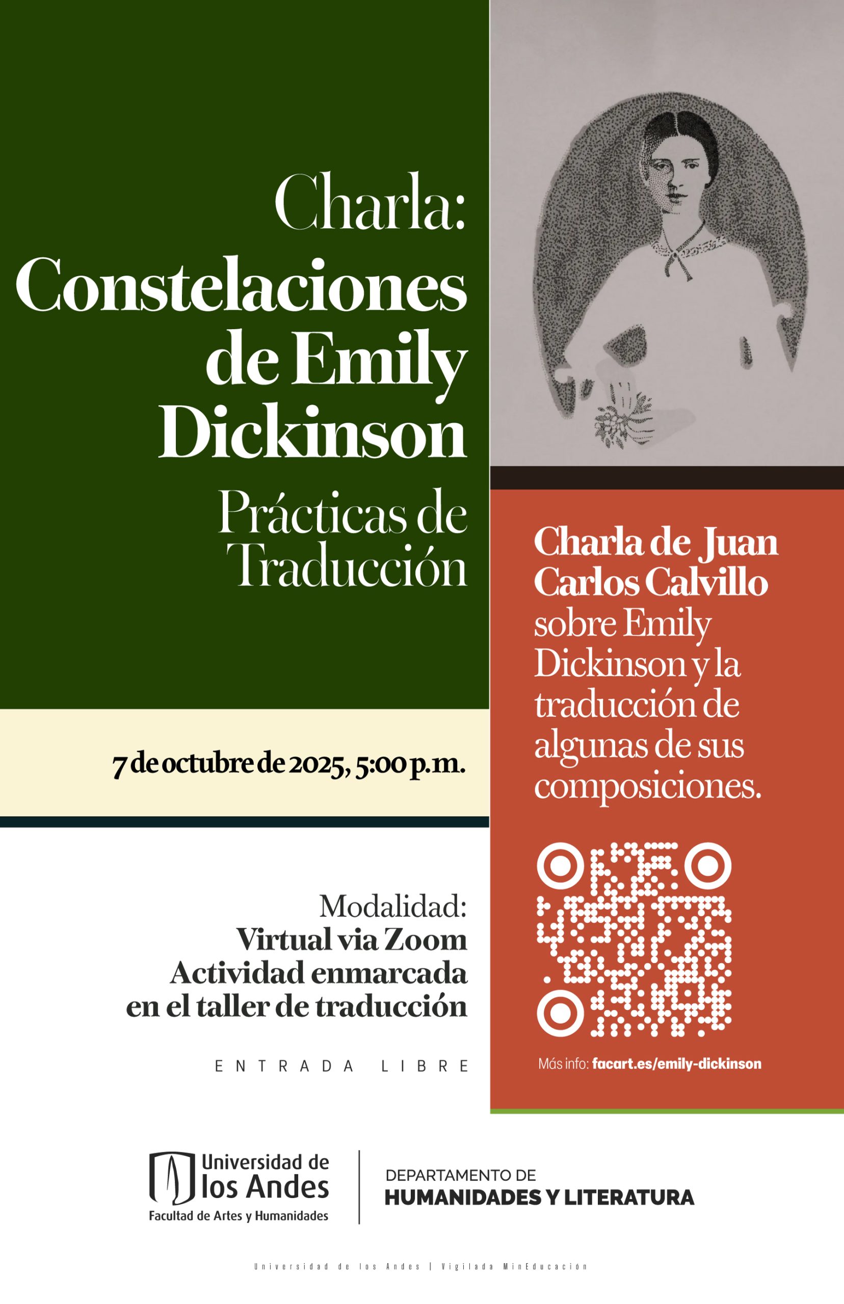 Charla virtual con Juan Carlos Calvillo sobre Emily Dickinson y la traducción de algunas de sus composiciones. Es una actividad en el marco del Taller de traducción, dirigido a los alumnos del taller y cualquier otro estudiante interesado en el tema.